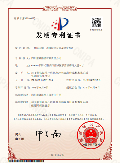 近日,康藏路橋公司申報的《一種隧道施工通風除塵裝置及除塵方法》(專利號:ZL 2025 1 0709126.4)成功獲得國家知識產(chǎn)權局頒發(fā)的發(fā)明專利授權,標志著康藏路橋公司在核心技術創(chuàng)新與自主知識產(chǎn)權高階布局領域邁出關鍵一步。