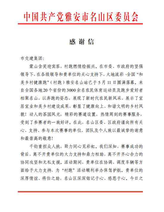 5月10日至11日,以“心向和美 逐夢(mèng)茶源”為主題的大地流彩·2025年全國(guó)和美鄉(xiāng)村健康跑(村跑)雅安名山站活動(dòng)在雅安市名山區(qū)成功舉辦。四川蜀通運(yùn)業(yè)有限責(zé)任公司作為運(yùn)輸保障單位,圓滿完成賽事期間各項(xiàng)運(yùn)輸保障任務(wù),為活動(dòng)的順利開展提供了堅(jiān)實(shí)保障,受到名山區(qū)委、區(qū)政府感謝信。