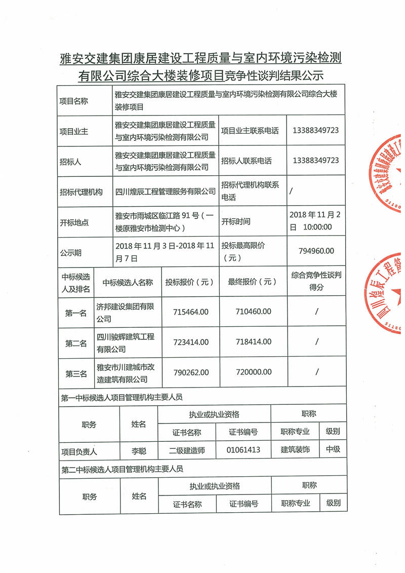 雅安交建集團康居建設(shè)工程質(zhì)量與室內(nèi)環(huán)境污染檢測有限公司綜合大樓裝修項目競爭性談判結(jié)果公示