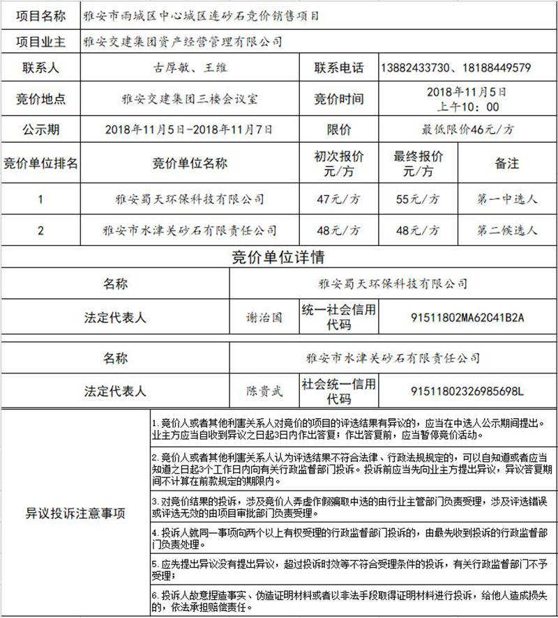 雅安交建集團(tuán)資產(chǎn)經(jīng)營(yíng)管理有限公司關(guān)于雅安市雨城區(qū)中心城區(qū)連砂石競(jìng)價(jià)銷(xiāo)售結(jié)果公示