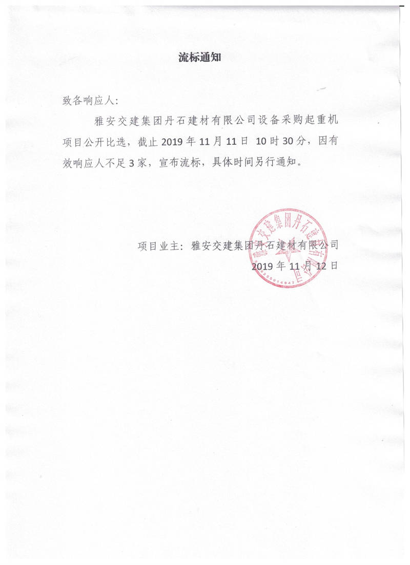 雅安交建集團丹石建材有限公司設(shè)備采購起重機項目流標通知