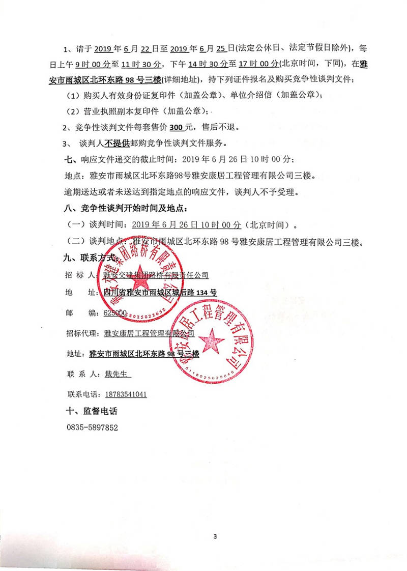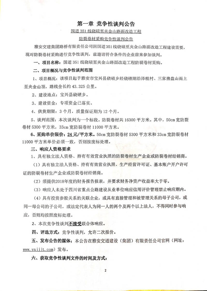 雅安交建集團(tuán)路橋有限責(zé)任公司國(guó)道351線磽磧至夾金山路面改造工程防裂卷材采購(gòu)競(jìng)爭(zhēng)性談判公告