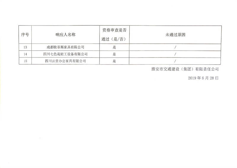 雅安市交通建設(集團)有限責任公司辦公家具供應商入庫比選結果