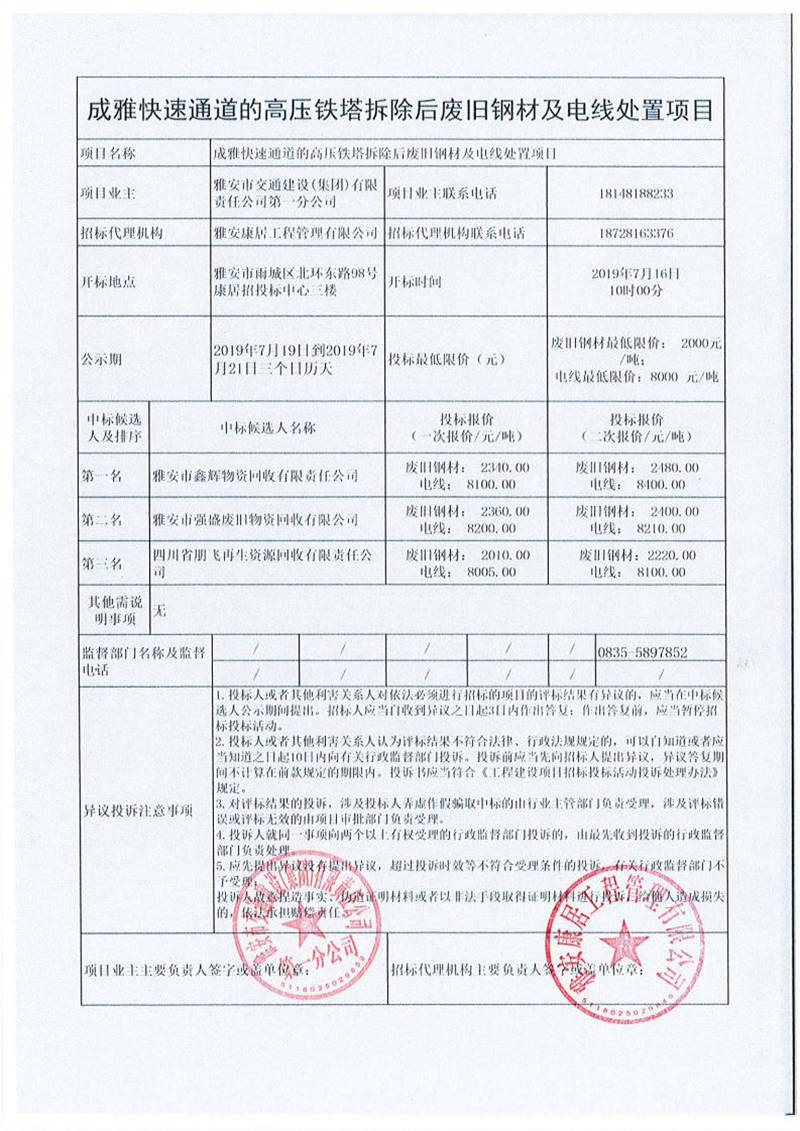 雅安市交通建設(shè)(集團(tuán))有限責(zé)任公司第一分公司成雅快速通道的高壓鐵塔拆除后廢舊鋼材及電線處置項(xiàng)目競(jìng)價(jià)結(jié)果公示