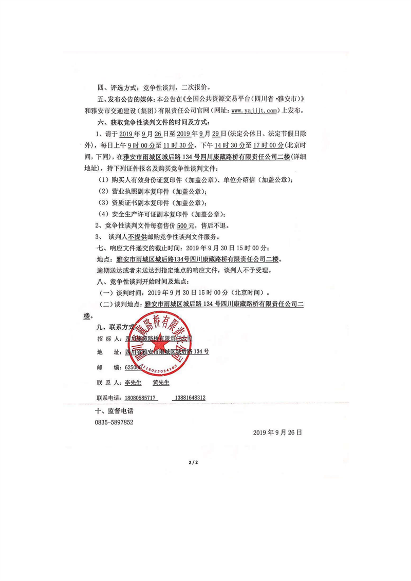 四川康藏路橋有限責(zé)任公司國(guó)道351線(xiàn)磽磧至夾金山段路面改造工程波形護(hù)欄采購(gòu)競(jìng)爭(zhēng)性談判公告