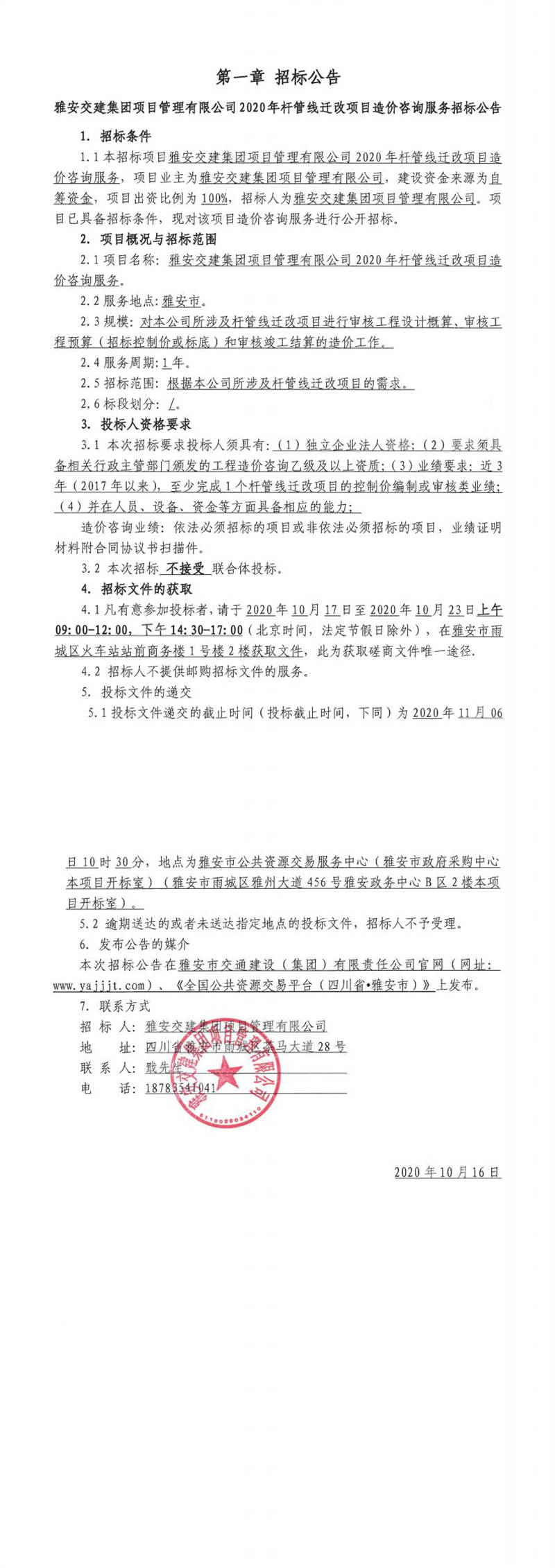 雅安交建集團(tuán)項(xiàng)目管理有限公司2020年桿管線遷改項(xiàng)目造價(jià)咨詢(xún)服務(wù)招標(biāo)公告