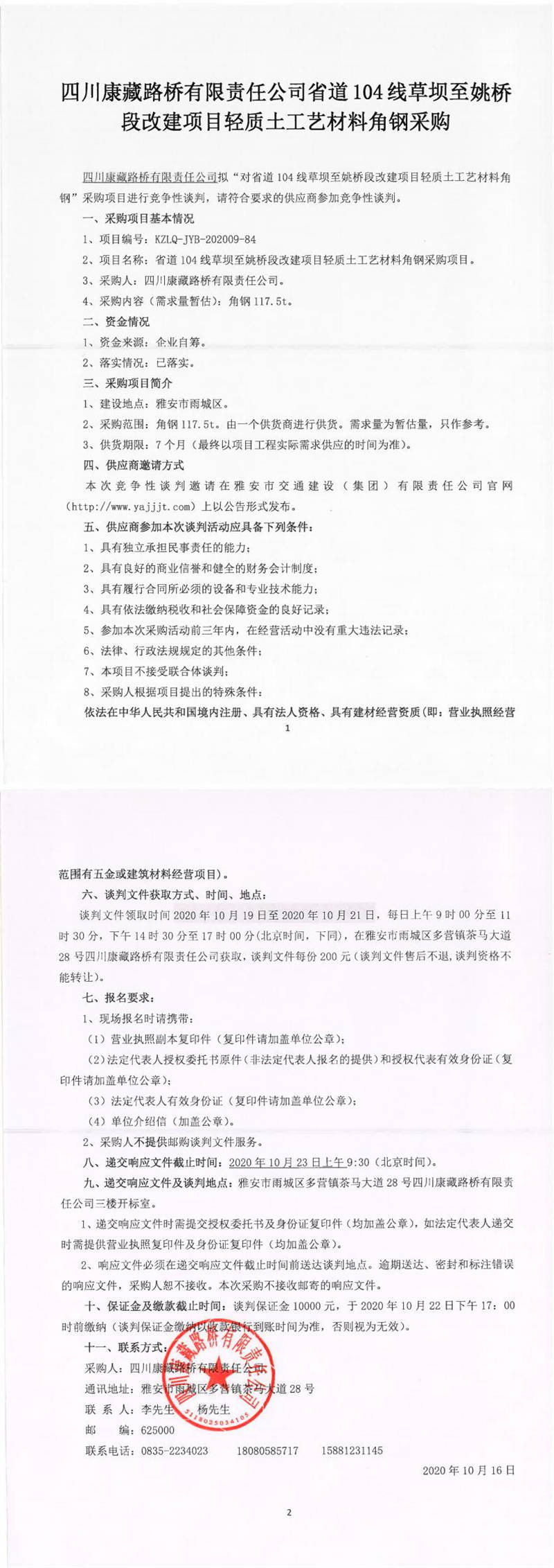 四川康藏路橋有限責(zé)任公司省道104線草壩至姚橋段改建項(xiàng)目輕質(zhì)土工藝材料角鋼采購競爭性談判公告