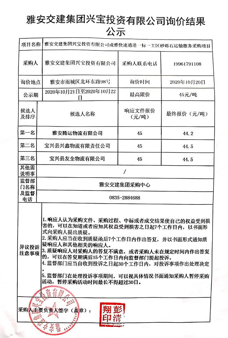 雅安交建集團(tuán)興寶投資有限公司成雅快速通道一標(biāo)一工區(qū)砂礫石運輸服務(wù)采購項目詢價結(jié)果公示