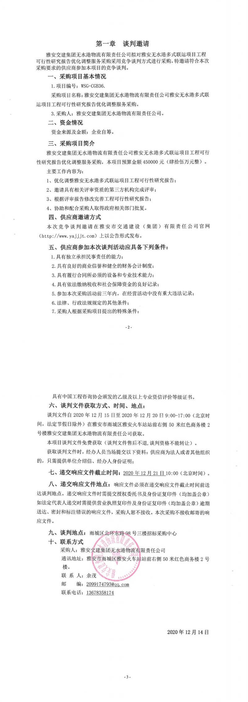 雅安交建集團無水港物流有限責(zé)任公司雅安無水港多式聯(lián)運項目工程可行性研究報告優(yōu)化調(diào)整服務(wù)采購競爭談判公告