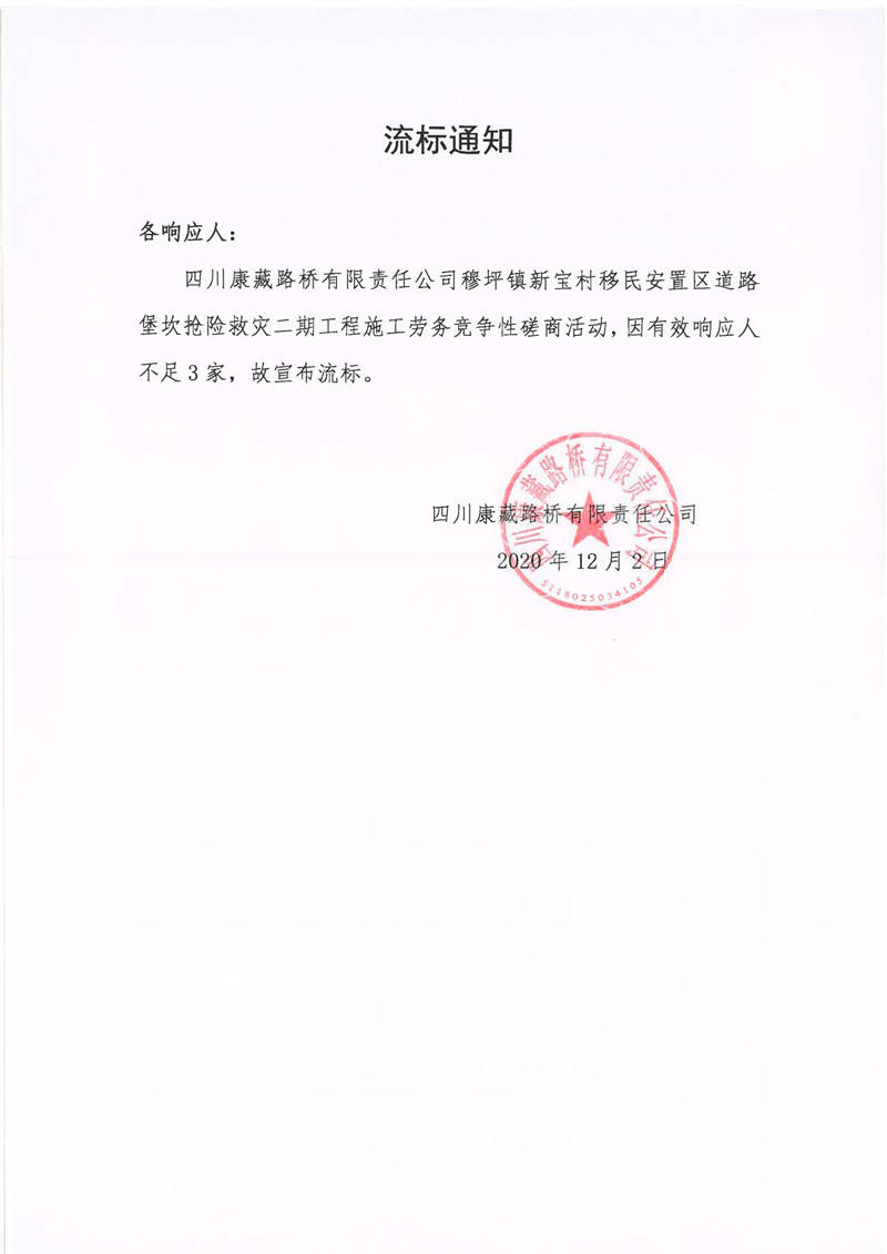 四川康藏路橋有限責任公司穆坪鎮(zhèn)新寶村移民安置區(qū)道路堡坎搶險救災二期工程施工勞務流標通知