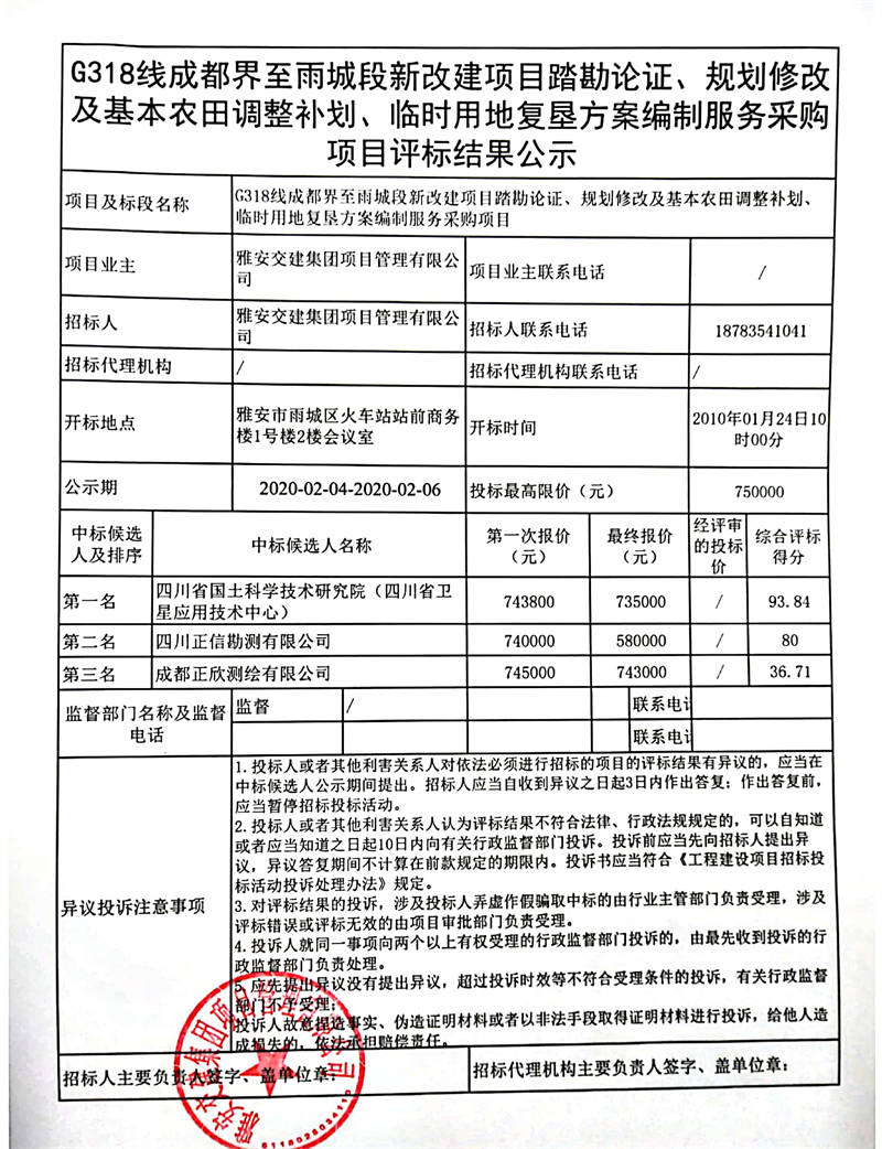 雅安交建集團(tuán)項(xiàng)目管理有限公司G318線(xiàn)成都界至雨城段新改建項(xiàng)目踏勘論證、規(guī)劃修改及基本農(nóng)田調(diào)整補(bǔ)劃、臨時(shí)用地復(fù)墾方案編制服務(wù)采購(gòu)項(xiàng)目評(píng)標(biāo)結(jié)果公示