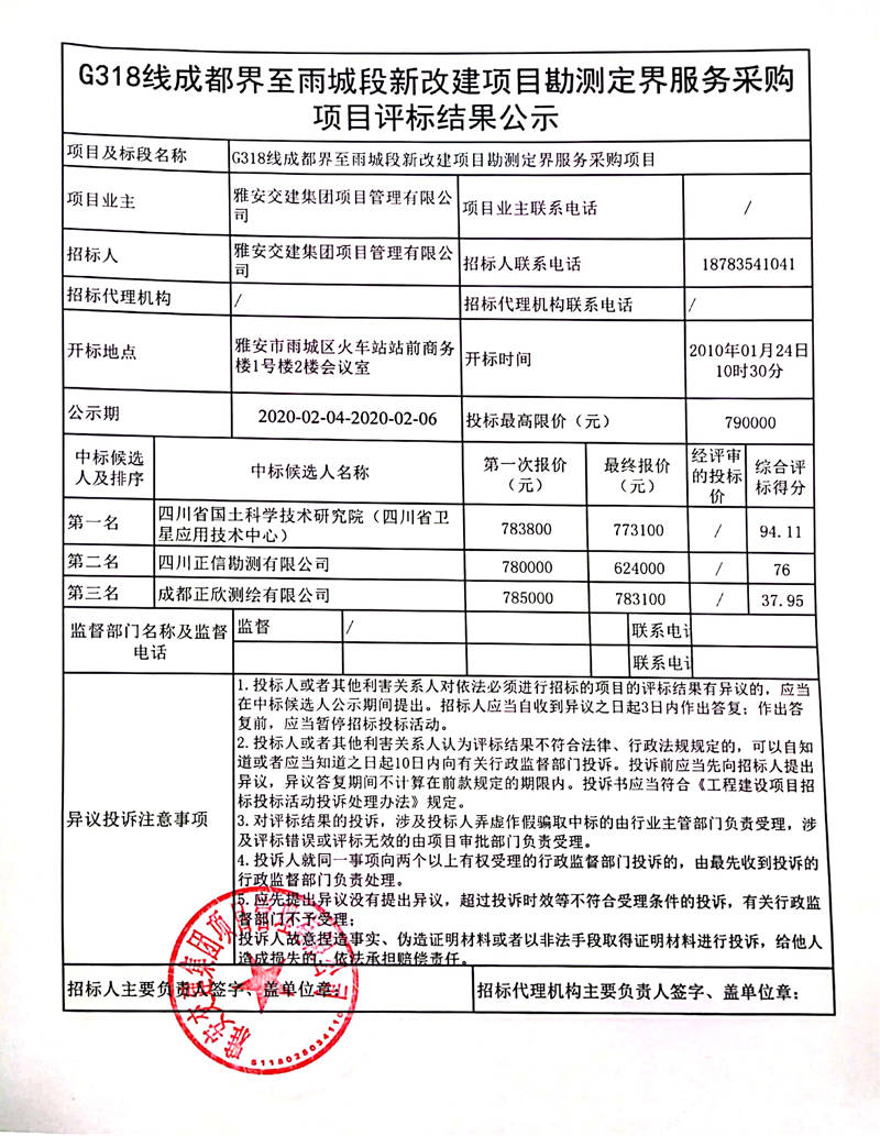 雅安交建集團項目管理有限公司G318線成都界至雨城段新改建項目勘測定界服務采購項目評標結果公示