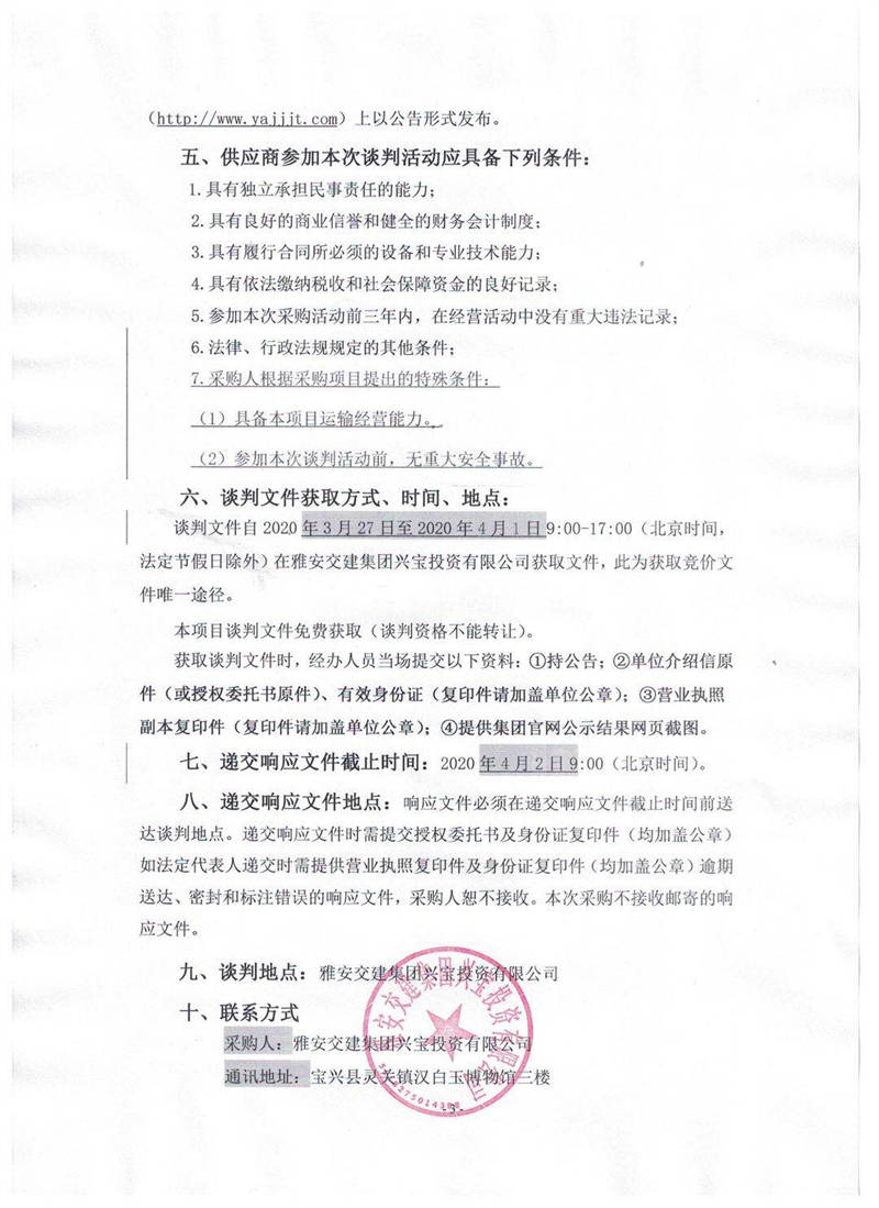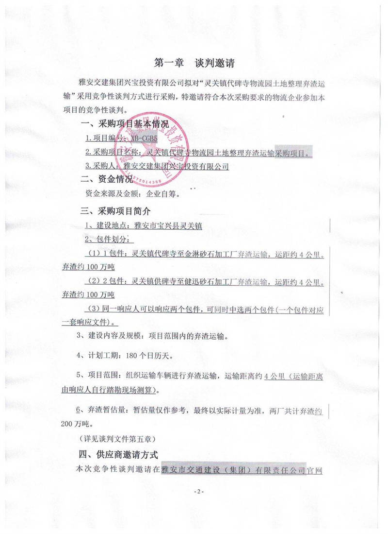 雅安交建集團(tuán)興寶投資有限公司靈關(guān)鎮(zhèn)代碑寺物流園土地整理?xiàng)壴\(yùn)輸采購(gòu)項(xiàng)目競(jìng)爭(zhēng)性談判公告