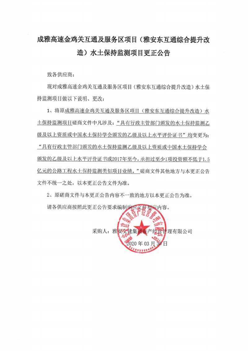 雅安交建集團(tuán)資產(chǎn)經(jīng)營管理有限公司成雅高速金雞關(guān)互通及服務(wù)區(qū)項(xiàng)目(雅安東互通綜合提升改造)水土保持監(jiān)測(cè)項(xiàng)目更正公告