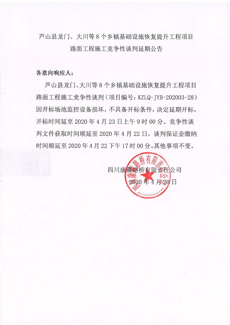 四川康藏路橋有限責(zé)任公司蘆山縣龍門、大川等8個鄉(xiāng)鎮(zhèn)基礎(chǔ)設(shè)施恢復(fù)提升工程項(xiàng)目路面工程施工競爭性談判延期公告