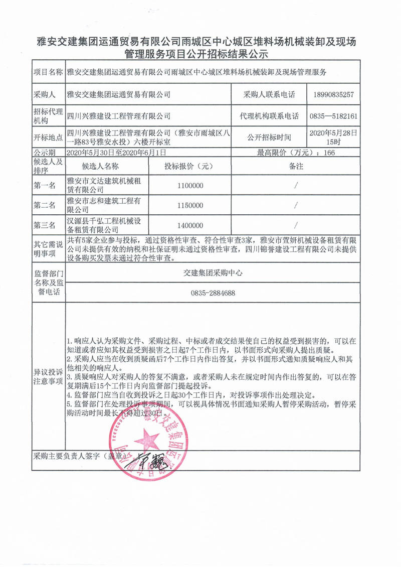 雅安交建集團(tuán)運(yùn)通貿(mào)易有限公司雨城區(qū)中心城區(qū)堆料場機(jī)械裝卸及現(xiàn)場管理服務(wù)項目公開招標(biāo)結(jié)果公示