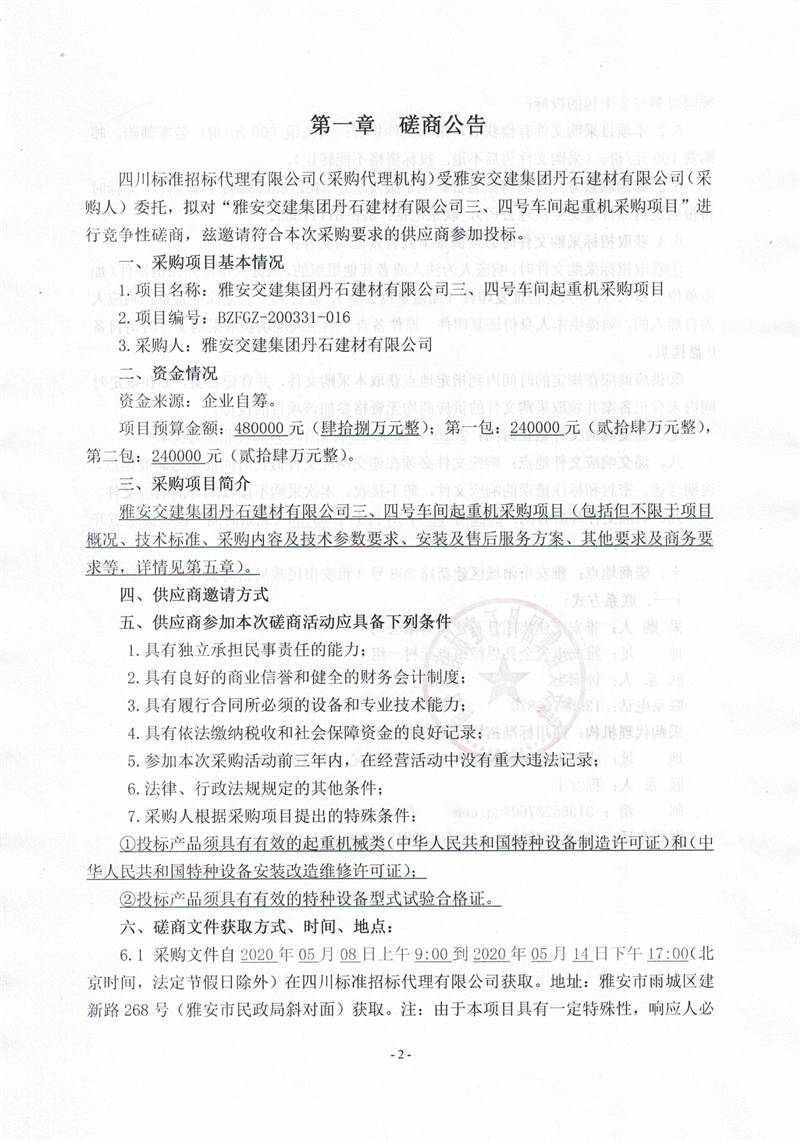 雅安交建集團(tuán)丹石建材有限公司三、四號車間起重機(jī)采購項(xiàng)目競爭性磋商公告