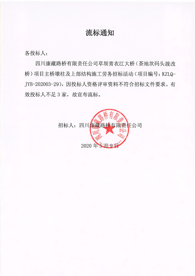 四川康藏路橋有限責任公司草壩青衣江大橋(茶地坎碼頭渡改橋)項目主橋墩柱及上部結(jié)構(gòu)施工勞務流標通知