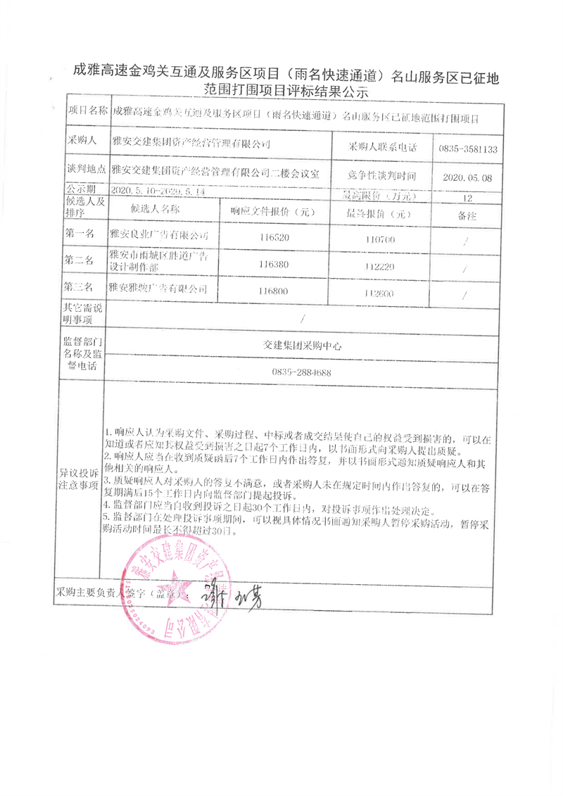 雅安交建集團資產(chǎn)經(jīng)營管理有限公司成雅高速金雞關互通及服務區(qū)項目(雨名快速通道)名山服務區(qū)已征地范圍打圍項目評標結果公示