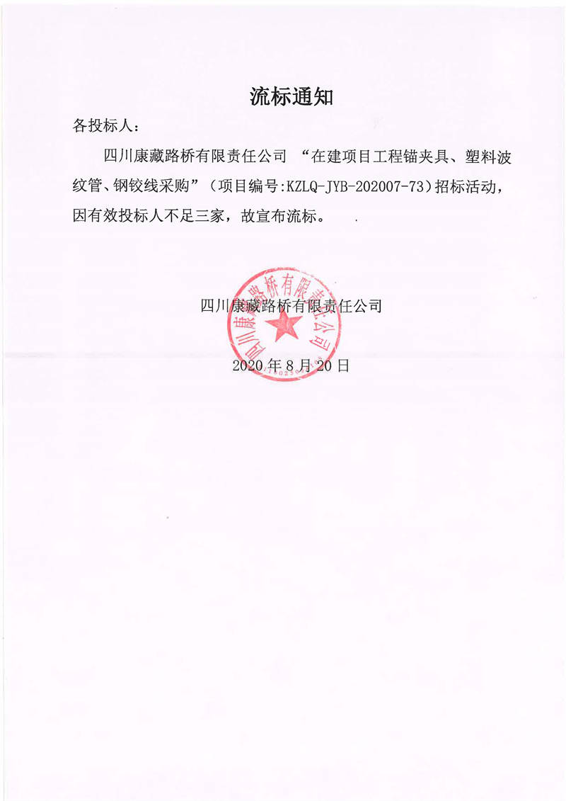 四川康藏路橋有限責(zé)任公司在建項(xiàng)目工程錨夾具、塑料波紋管、鋼鉸線采購流標(biāo)通知
