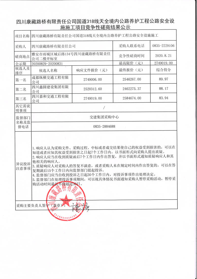 四川康藏路橋有限責(zé)任公司國道318線天全境內(nèi)公路養(yǎng)護工程公路安全設(shè)施施工項目競爭性磋商結(jié)果公示