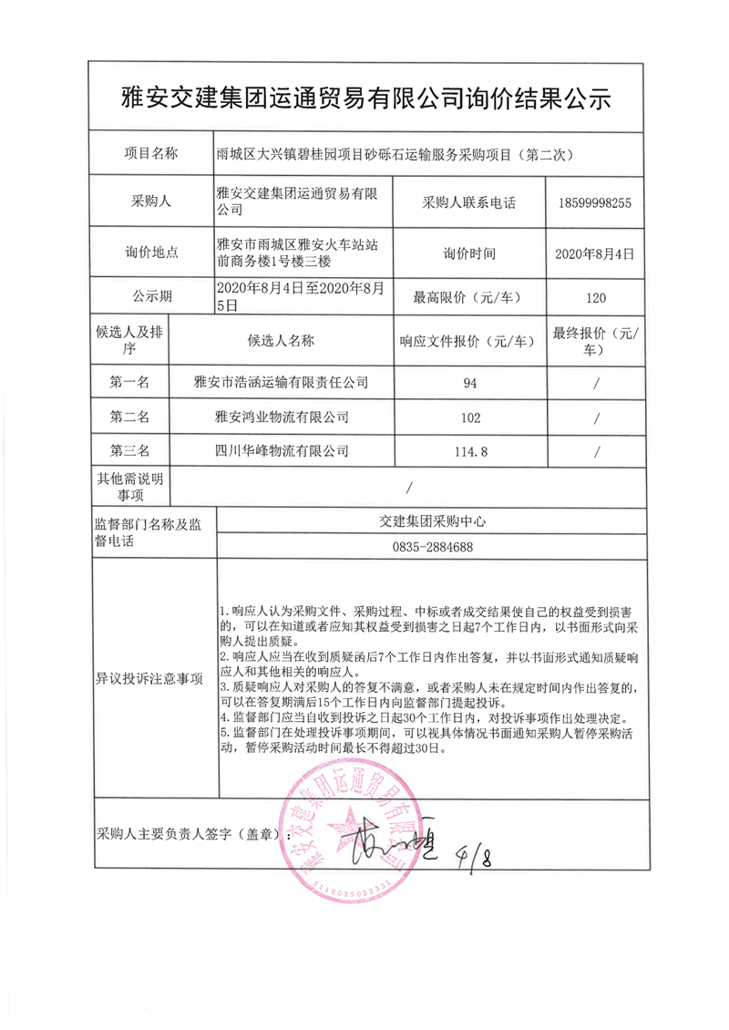 雅安交建集團(tuán)運(yùn)通貿(mào)易有限公司雨城區(qū)大興鎮(zhèn)碧桂園項(xiàng)目砂礫石運(yùn)輸服務(wù)采購項(xiàng)目(第二次)詢價(jià)結(jié)果公示