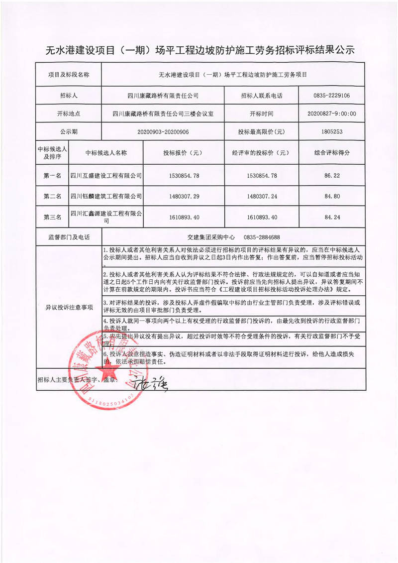 四川康藏路橋有限責(zé)任公司無水港建設(shè)項目(一期)場平工程邊坡防護施工勞務(wù)招標評標結(jié)果公示
