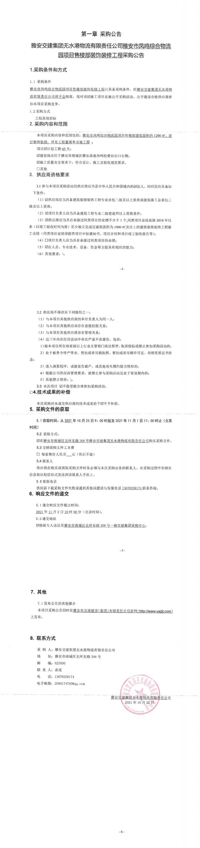 雅安交建集團(tuán)無水港物流有限責(zé)任公司雅安市鳳鳴綜合物流園項(xiàng)目售樓部裝飾裝修工程(第二次)采購公告