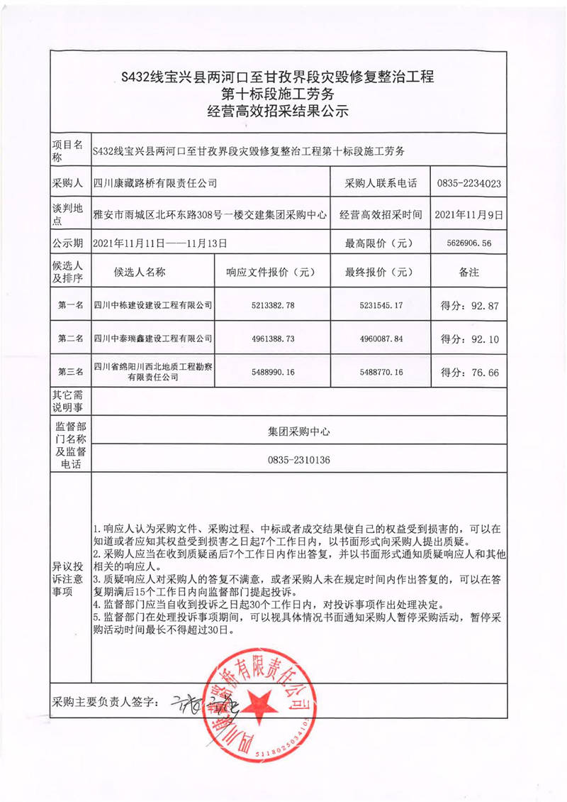四川康藏路橋有限責任公司S432線寶興縣兩河口至甘孜界段災毀修復整治工程第十標段施工勞務經(jīng)營高效招采結(jié)果公示