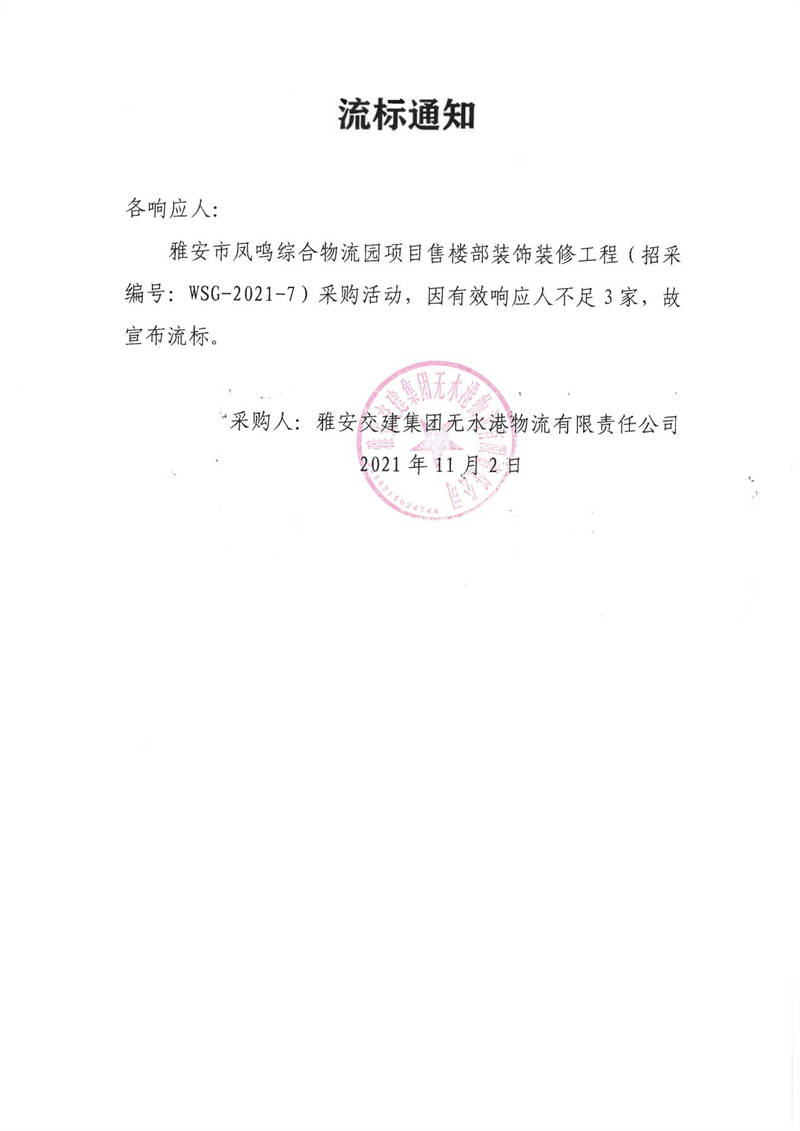 雅安交建集團(tuán)無(wú)水港物流有限責(zé)任公司雅安市鳳鳴綜合物流園項(xiàng)目售樓部裝飾裝修工程采購(gòu)流標(biāo)通知