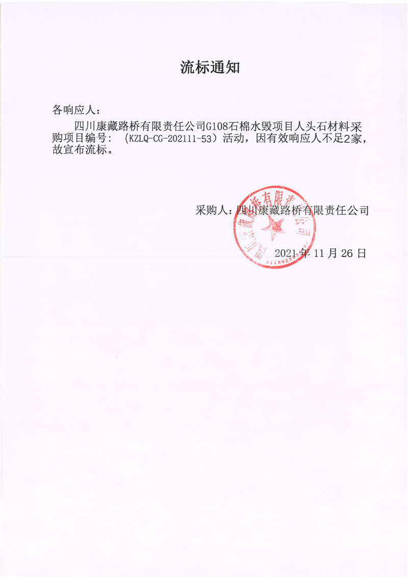 四川康藏路橋有限責(zé)任公司G108石棉水毀項(xiàng)目人頭石材料采購流標(biāo)通知