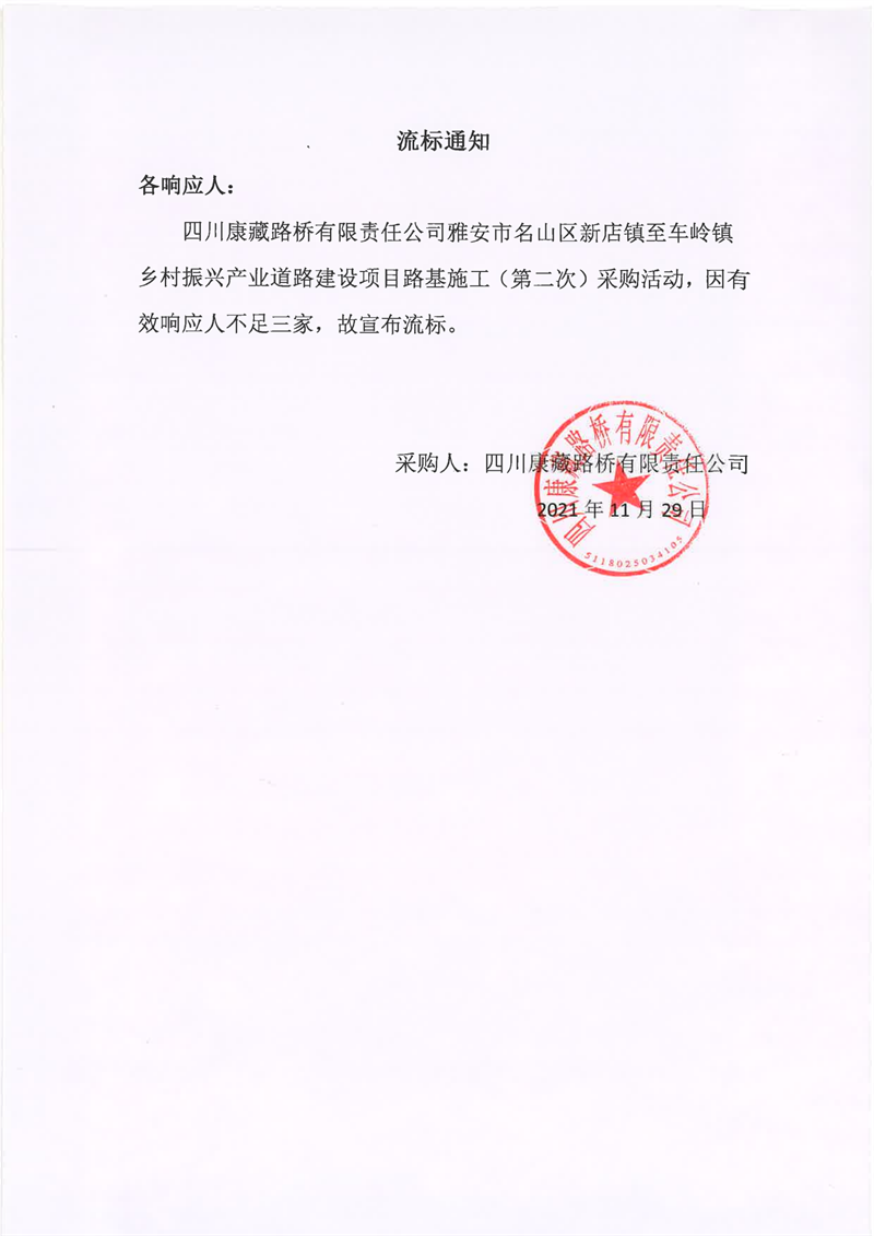 四川康藏路橋有限責(zé)任公司雅安市名山區(qū)新店鎮(zhèn)至車(chē)嶺鎮(zhèn)鄉(xiāng)村振興產(chǎn)業(yè)道路建設(shè)項(xiàng)目路面施工(第二次)流標(biāo)通知