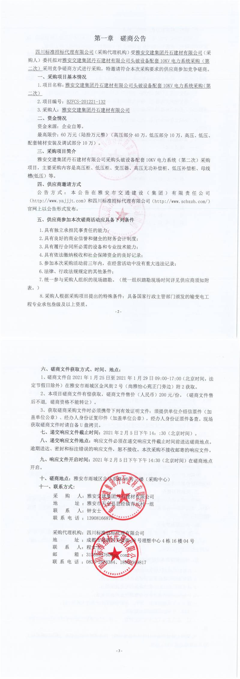 雅安交建集團(tuán)丹石建材有限公司頭破設(shè)備配套10KV電力系統(tǒng)采購(第二次)競爭磋商公告