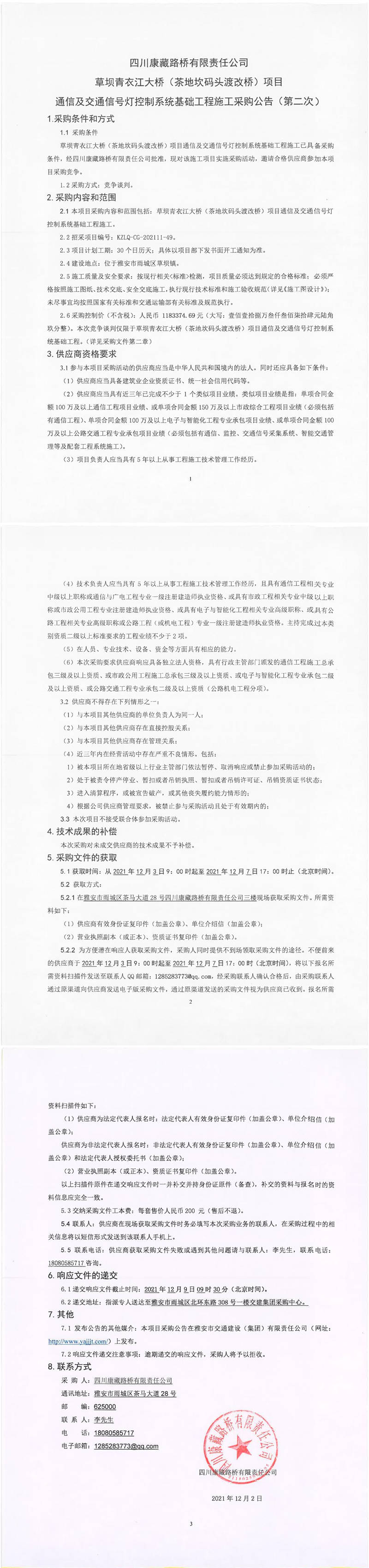 四川康藏路橋有限責(zé)任公司草壩青衣江大橋(茶地坎碼頭渡改橋)項(xiàng)目通信及交通信號燈控制系統(tǒng)基礎(chǔ)工程施工采購公告(第二次)