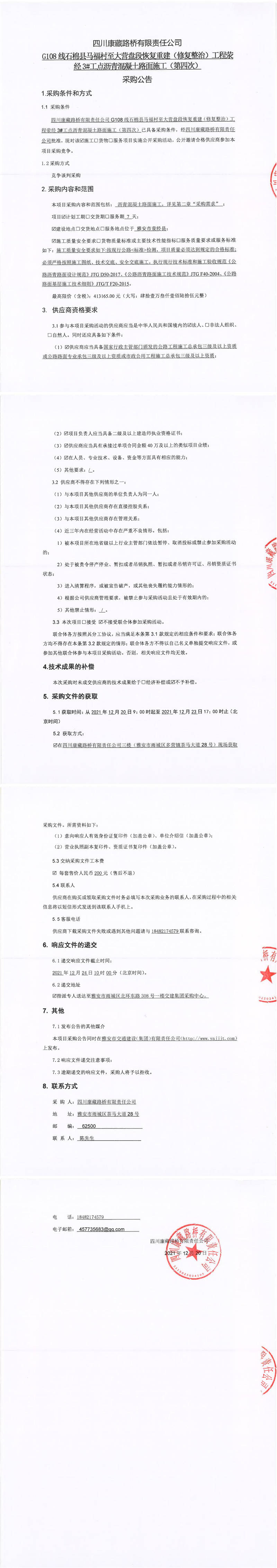 四川康藏路橋有限責(zé)任公司G108線石棉縣馬福村至大營(yíng)盤段恢復(fù)重建(修復(fù)整治)工程滎經(jīng)3#工點(diǎn)瀝青混凝土路面施工(第四次)采購公告