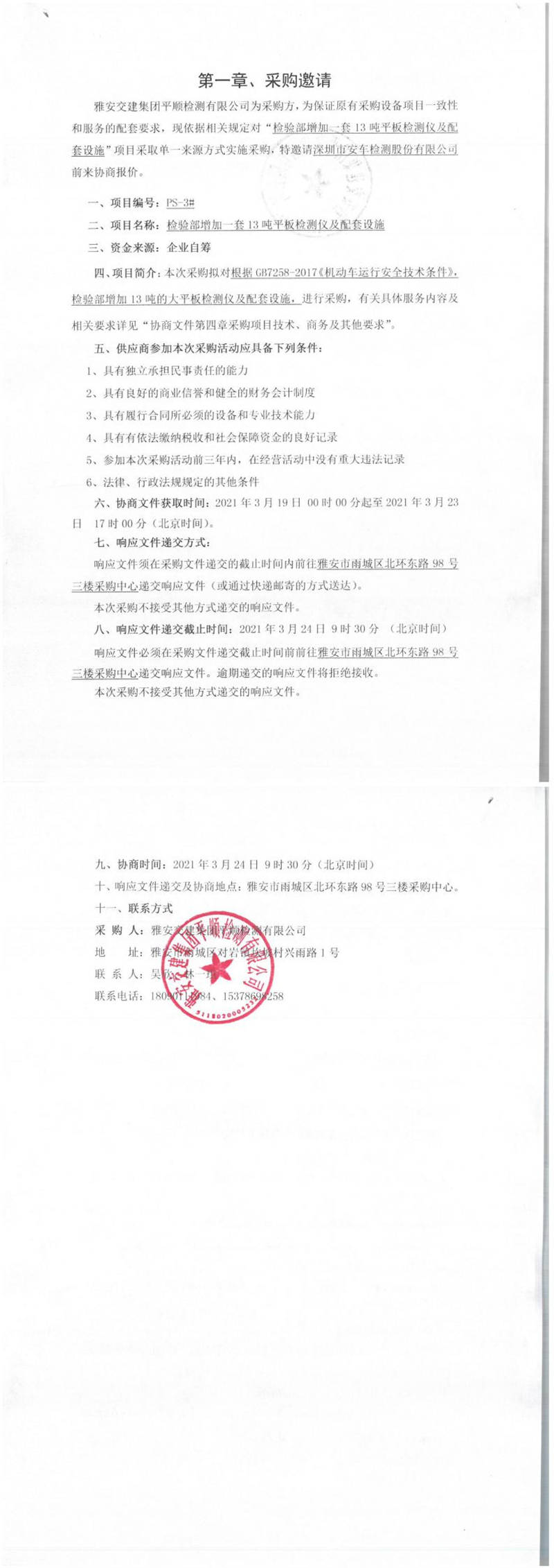 雅安交建集團平順檢測有限公司檢驗部增加一套13噸平板檢測儀及配套設施單一來源采購邀請