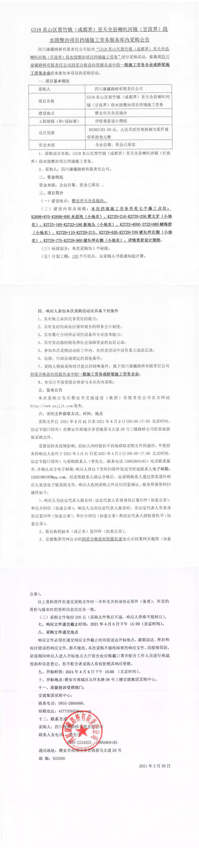 四川康藏路橋有限責(zé)任公司G318名山區(qū)黑竹鎮(zhèn)(成都界)至天全縣喇叭河鎮(zhèn)(甘孜界)段水毀整治項(xiàng)目擋墻施工勞務(wù)服務(wù)庫(kù)內(nèi)采購(gòu)公告