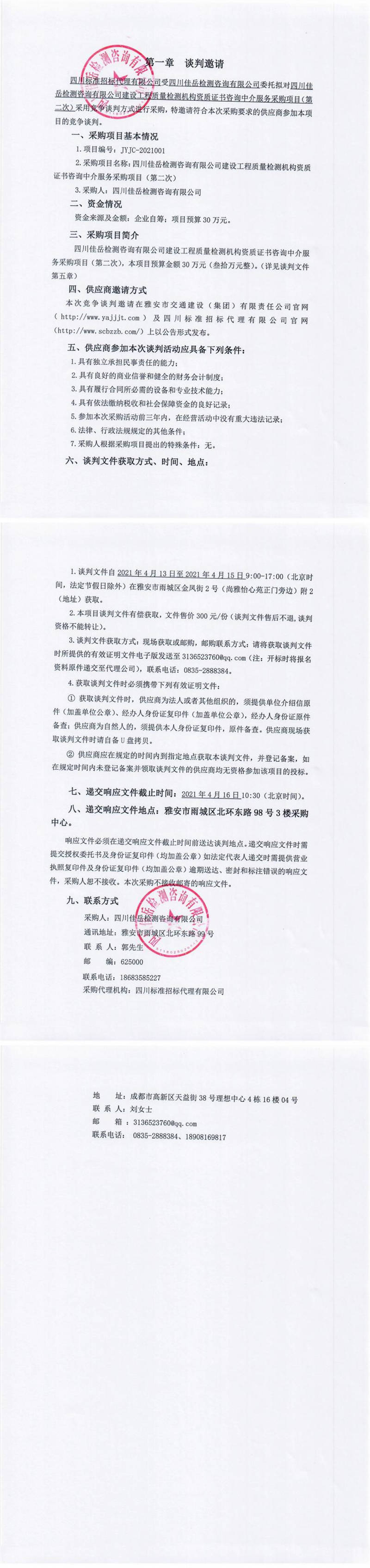 四川佳岳檢測咨詢有限公司建設工程質(zhì)量檢測機構(gòu)資質(zhì)證書咨詢中介服務采購項目(第二次)競爭談判公告