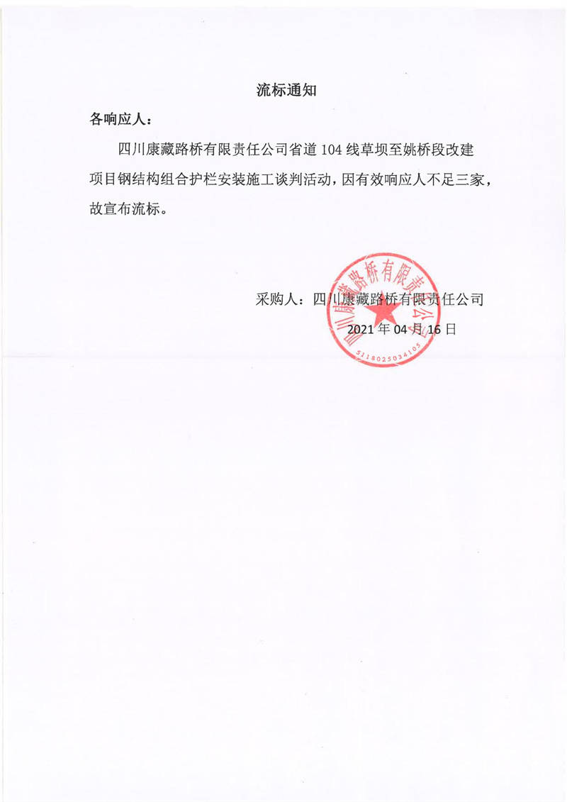 四川康藏路橋有限責任公司省道104線草壩至姚橋段改建項目鋼結構組合護欄安裝施工流標通知