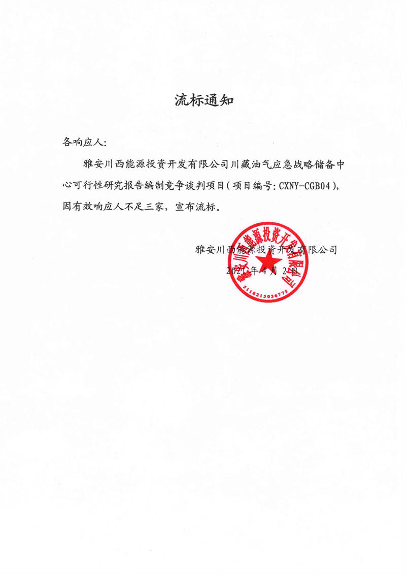 雅安川西能源投資開(kāi)發(fā)有限公司川藏油氣應(yīng)急戰(zhàn)略?xún)?chǔ)備中心可行性研究報(bào)告編制競(jìng)爭(zhēng)談判項(xiàng)目流標(biāo)通知