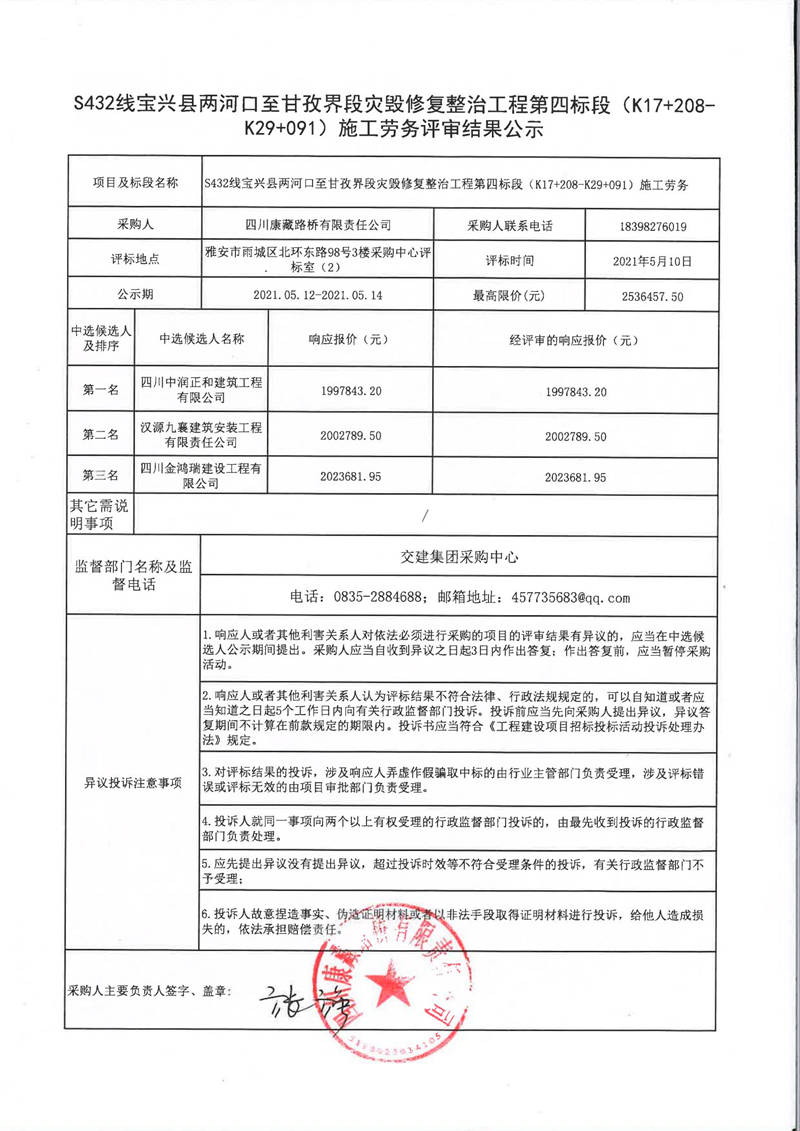 四川康藏路橋有限責任公司S432線寶興縣兩河口至甘孜界段災毀修復整治工程第四標段(K17+208-K29+091)施工勞務評審結果公示