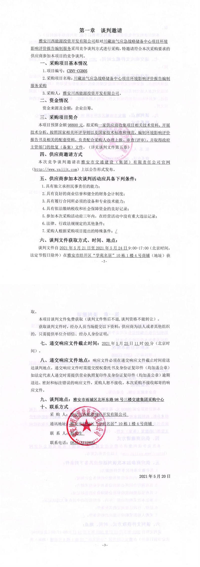 雅安川西能源投資開發(fā)有限公司川藏油氣應(yīng)急戰(zhàn)略儲備中心項(xiàng)目環(huán)境影響評價報告編制服務(wù)采購競爭談判公告