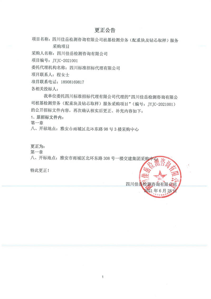 四川佳岳檢測咨詢有限公司樁基檢測勞務(配重塊及鉆芯取樣)服務采購項目更正公告