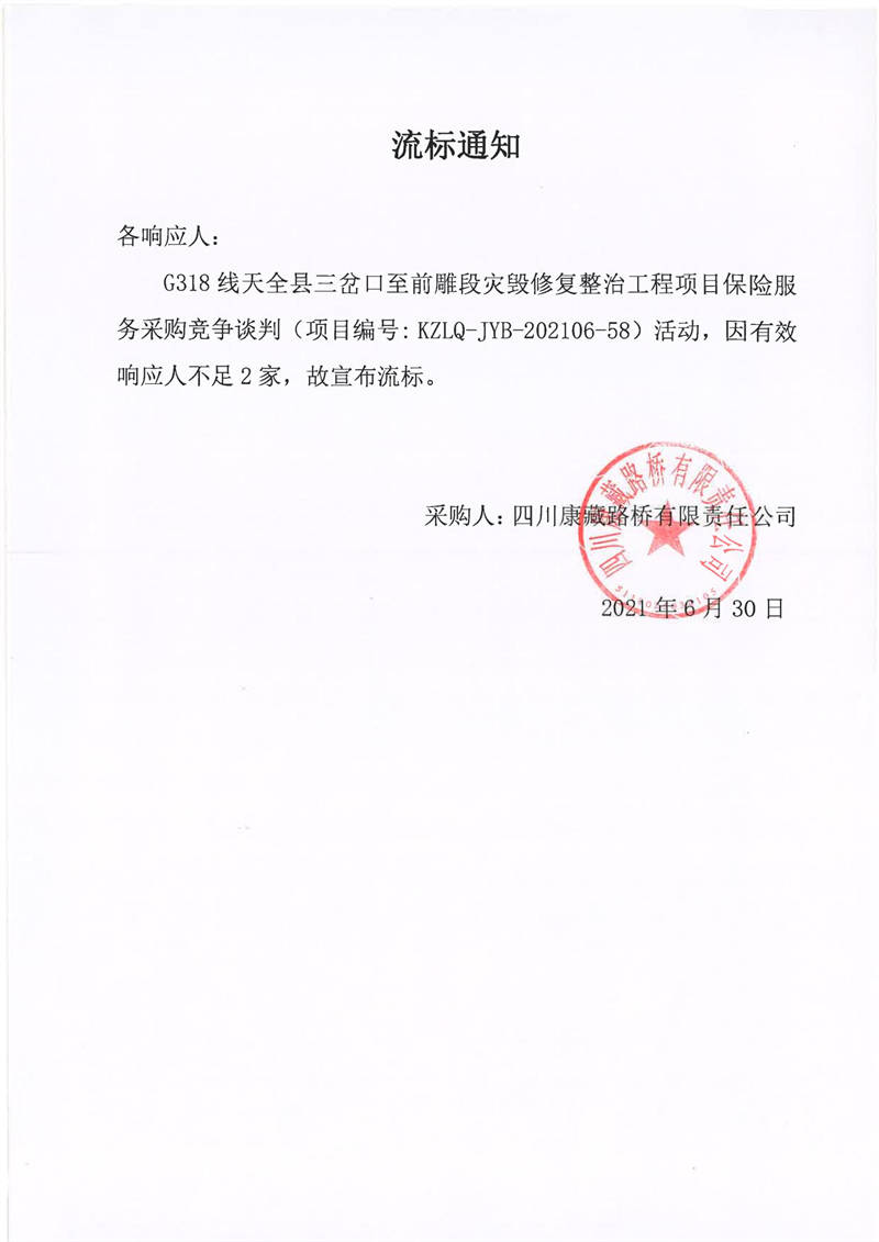 四川康藏路橋有限責(zé)任公司G318線天全縣三岔口至前雕段災(zāi)毀修復(fù)整治工程項(xiàng)目保險(xiǎn)服務(wù)采購(gòu)流標(biāo)通知
