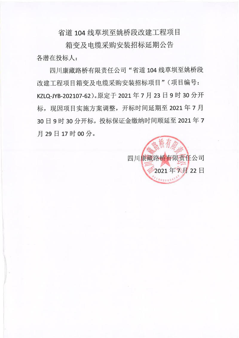 四川康藏路橋有限責(zé)任公司省道104線草壩至姚橋段改建項(xiàng)目箱變及電纜采購安裝招標(biāo)延期公告