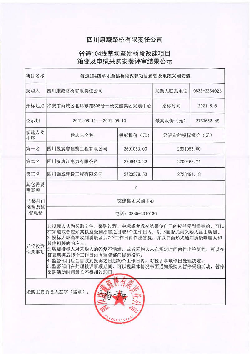 四川康藏路橋有限責(zé)任公司省道104線草壩至姚橋段改建項(xiàng)目箱變及電纜采購安裝評(píng)審結(jié)果公示