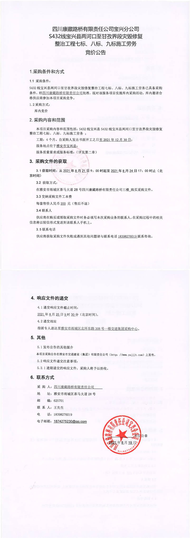 四川康藏路橋有限責任公司寶興分公司S432線寶興縣兩河口至甘孜界段災毀修復整治工程七標、八標、九標施工勞務(wù)競價公告