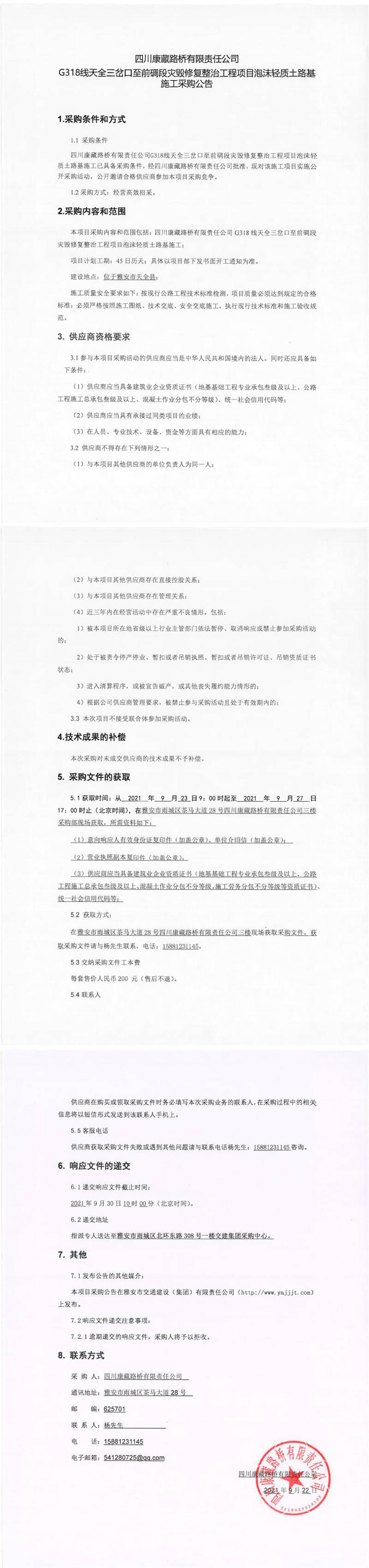 四川康藏路橋有限責(zé)任公司G318線天全三岔口至前碉段災(zāi)毀修復(fù)整治工程項目泡沫輕質(zhì)土路基施工采購公告