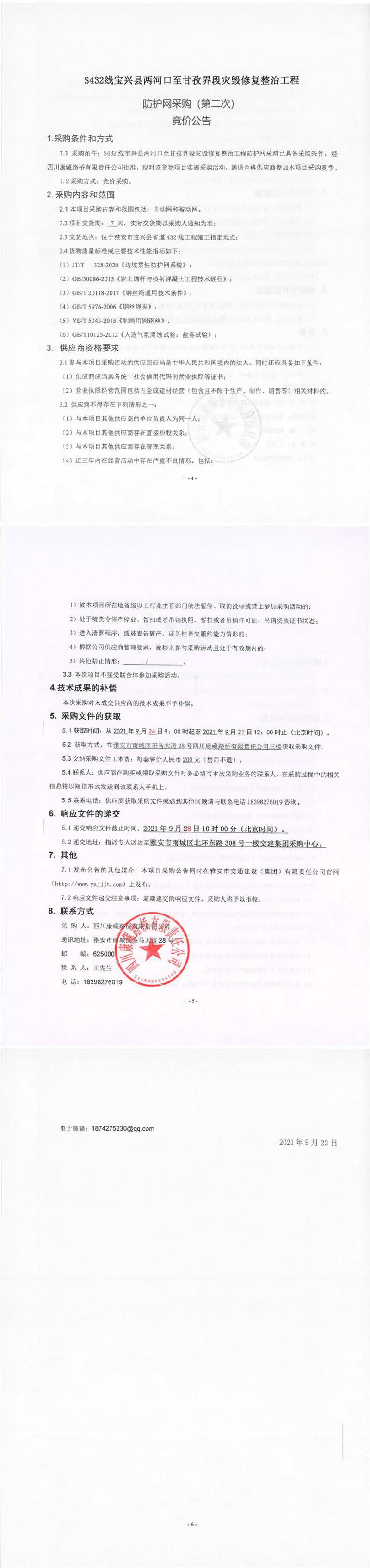 四川康藏路橋有限責(zé)任公司S432線寶興縣兩河口至甘孜界段災(zāi)毀修復(fù)整治工程防護(hù)網(wǎng)采購(第二次)競價公告