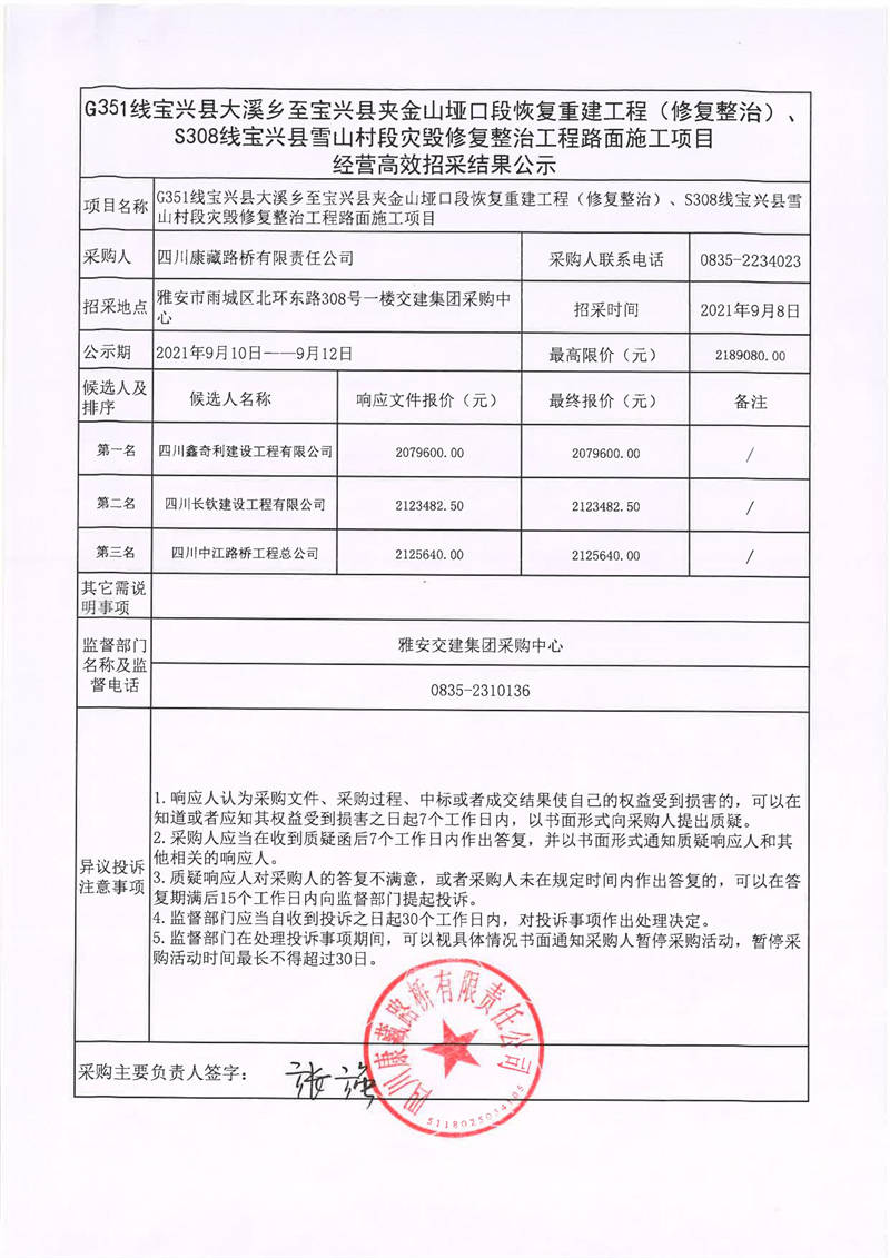 四川康藏路橋有限責(zé)任公司G351線寶興縣大溪鄉(xiāng)至寶興縣夾金山啞口段恢復(fù)重建工程(修復(fù)整治)、S308線寶興縣雪山村段災(zāi)毀修復(fù)整治工程路面施工項(xiàng)目經(jīng)營高效招采結(jié)果公示